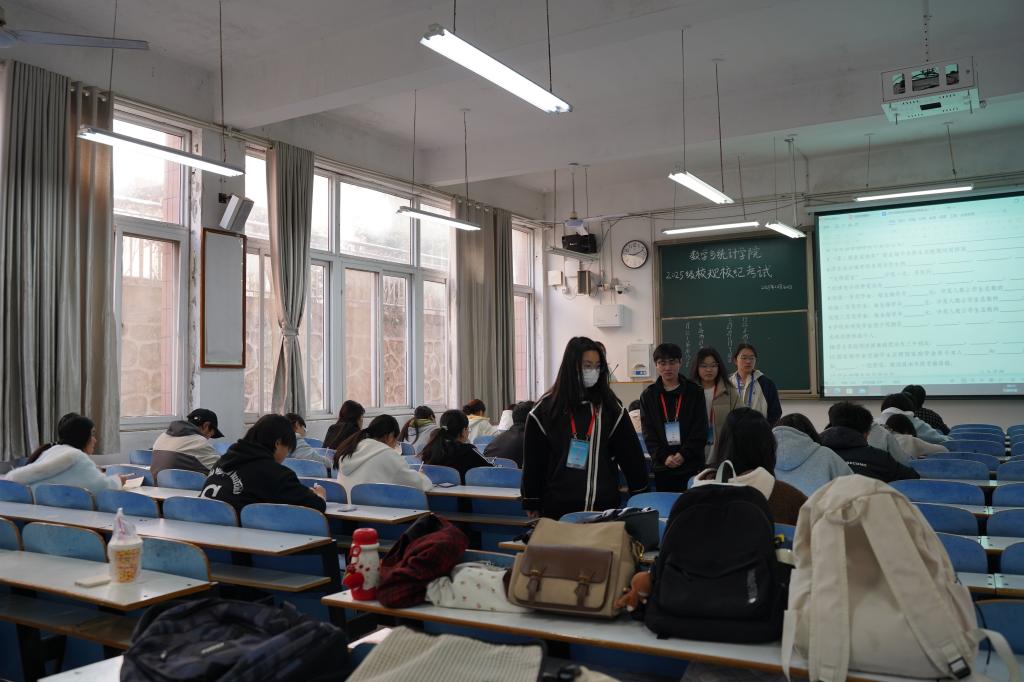 考试过程中,新生们主动将电子设备放置指定位置,专注审题作答,考场氛围肃静有序;监考人员尽职尽责,规范收发试卷,密切关注考场动态;巡考小组穿梭各考场,重点巡查纪律执行与考务规范,确保考试全程公平严谨。