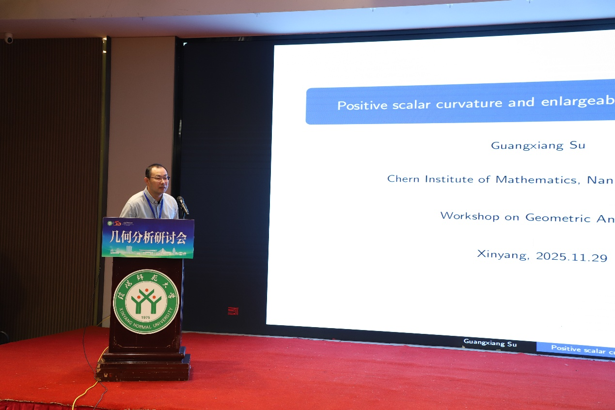 第二场报由南开大学苏广想教授带来,他以《Positive scalar curvature and enlargeable foliated manifolds》为题展开了深入讲解。报告由西南大学/贵州师范大学周家足教授主持。苏教授的演讲聚焦于“可扩流形”这一由Gromov和Lawson引入的核心概念。他首先总结了该领域的两个关键结论:一是闭可旋可扩流形上不存在正数量曲率度量,二是Hanke与Schick证明的此类流形上罗森伯格指数不消失。苏教授以此为基石,引领听众共同探索这些经典结论在叶状流形中的精彩推广与应用。
