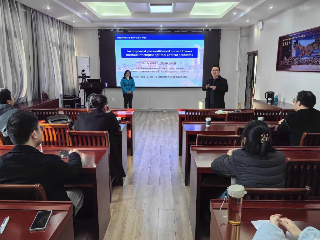 在报告中,曾闽丽教授系统介绍了椭圆型最优控制问题的研究背景及常用数值方法;随后,她针对有约束控制情形经先离散后优化方法所形成的非线性鞍点系统,构建了一个改进预处理非精确Uzawa(I-PIU)算法框架,并着重分析了该框架在非线性算子为单值时的全局收敛性;此外,基于I-PIU算法框架的第一步迭代中的新矩阵分裂技术,曾教授还建立了一种特殊的I-PIU方法,给出了收敛性的理论结果。最后,曾教授通过一系列数值实验验证了I-PIU方法在求解该类问题时的有效性和稳健性。