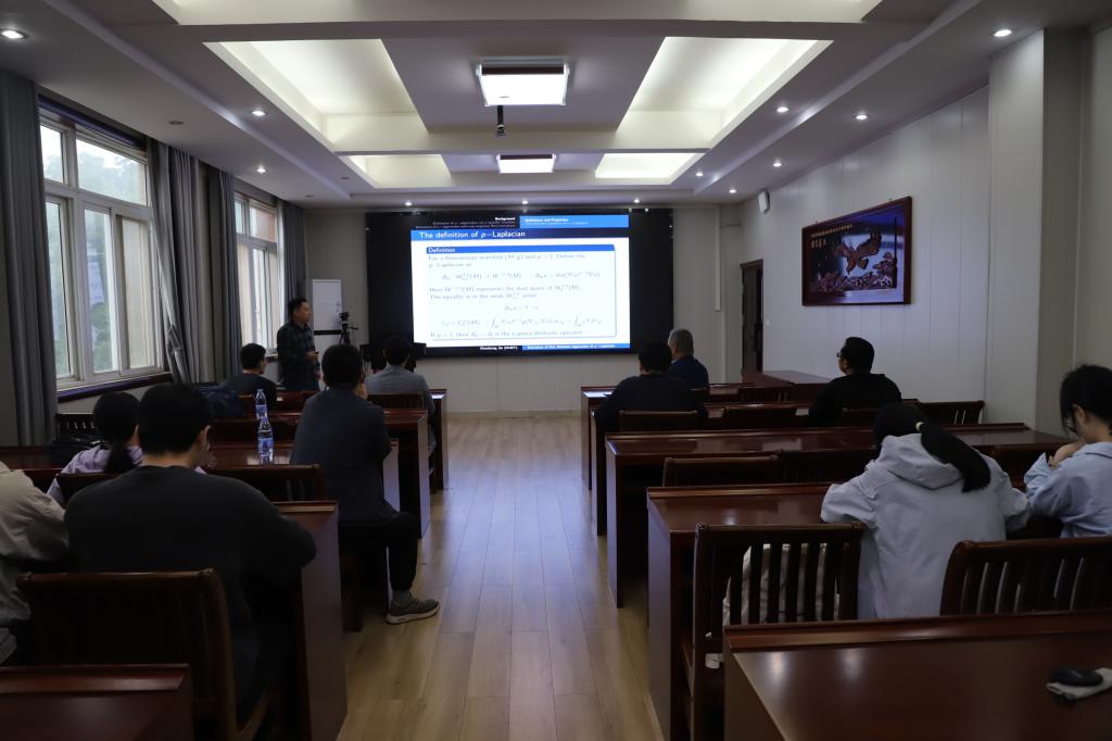 2026年4月28日上午,应澳门威尼斯人(中国)唯一官方网站 邀请,华中科技大学靳晓尚副教授作了题为《Estimates of the first Dirichlet eigenvalue of p-Laplacian in Riemannian manifolds》的报告。报告会由韩英波教授主持,部分老师和研究生聆听了此次报告。